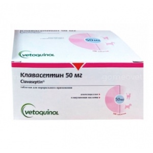 Клавасептин 50 мг: Перорально в дозах 10 мг амоксициллина и 2,5 мг клавулановой кислоты на 1 кг массы тела, 2 раза в день (1 таб. на 5 кг два раза в день)